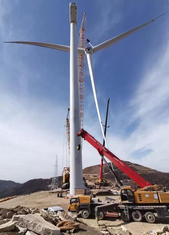 接下来最困难的工作就是安装风机。风场往往选址在风力猛烈的陡壁峭峰之中,只身徒步都艰难无比。更何况是要把机舱抬上山!能否顺利上山在每个人心中都要打一个大大的问号。望着这一百多吨的庞然大物,现场的工作人员没有一人退缩,在架好所有的机械力量后,塔筒运输队、机舱运输队、叶片运输队的全体成员互相对视了一眼,彼此点头示意,用眼神宣誓:我们一定要打赢这场“硬仗”!就这样四台铲车、一个拖拽车经过两天的时间终于安全地把机舱运上山头。最终,经过四个月的努力,在全体施工人员夜以继日的坚守下,平鲁掌柜窑风电项目风机于 10 月 2 日圆满完成吊装工作,并且比原计划并网的时间提前了足足 2 个月,于 2020 年 10 月 31 日 21:33 一次性并网成功,彰显了太重的担当。