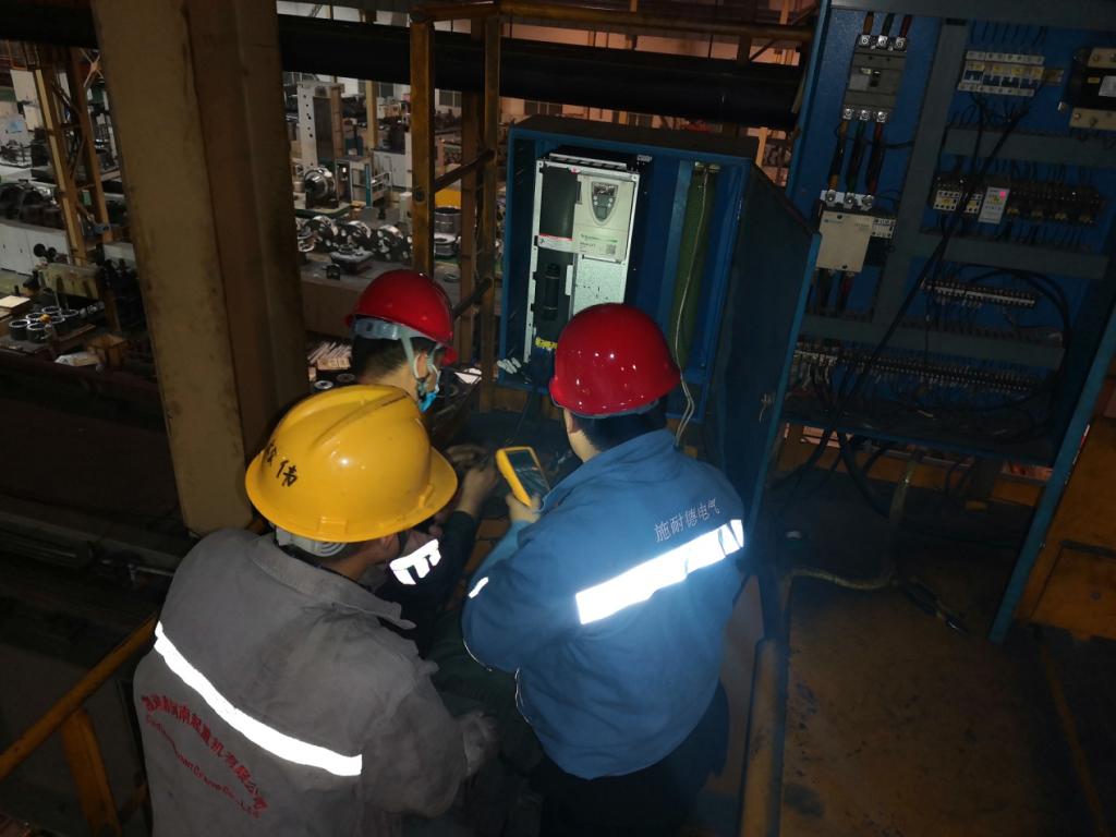 训练有素的维修人员在高达 15 米的行车端梁配电箱处进行更换调试,但行车断梁上空间狭小,更换装卸还需要有人从旁协助。此时车间的工人都在各自岗位上热火朝天的忙碌着,没有多余人手。“早一秒修好,我们就能早一秒投入生产”。分公司领导果断戴上防护措施,爬到端梁平台为维修人员照明、递线,一滴滴汗水从脸颊滑落,一组组数据调试成功。终于在维修人员的竭力抢修,调试工程师及集团职能部门相关人员的全程参与努力下,当晚23点,行车恢复了正常运行,快速、慢速两档行进速度都达到安全标准。装 配、试车工作得以继续开展,两台3MW增速器顺利发运,按期交付用户。