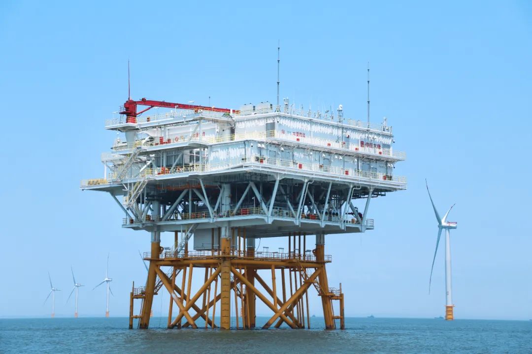 海上升压站整体外形尺寸为40×40×24米,单体重量达2550.7吨,是国内同容量级别重量最轻、设计最先进的升压站,也是全国首个海上220KV全预制舱组块海上风电升压站。实际建造时间139天,运到现场后海上整体吊装一天,焊接安装两天,随后快速进入联调阶段,创造了国内预制式升压站陆上建造最短工期记录。