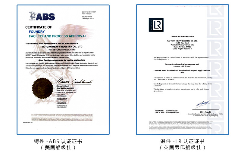 针对铸件、锻件产品,太重取得了美国船级社(ABS)、英国劳氏船级社(LR)等世界多个国家的认证证书。